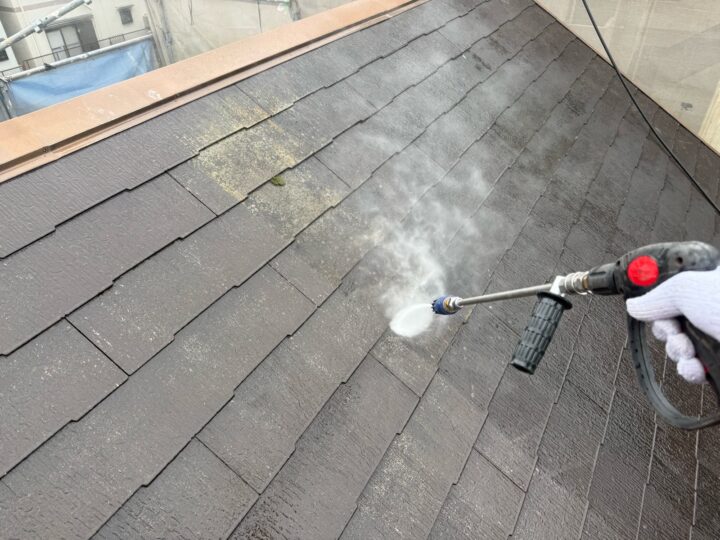 水が濁り汚水が外壁を汚さないように屋根から洗浄を行います。