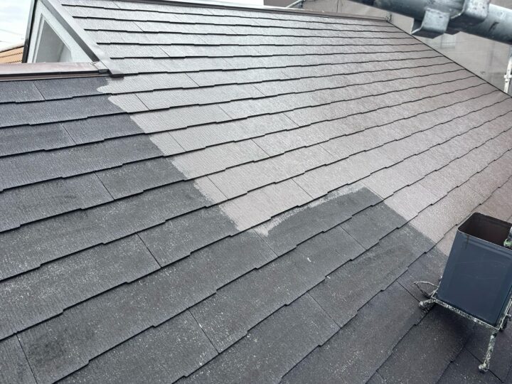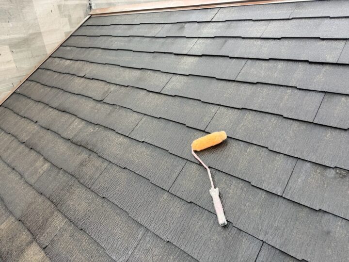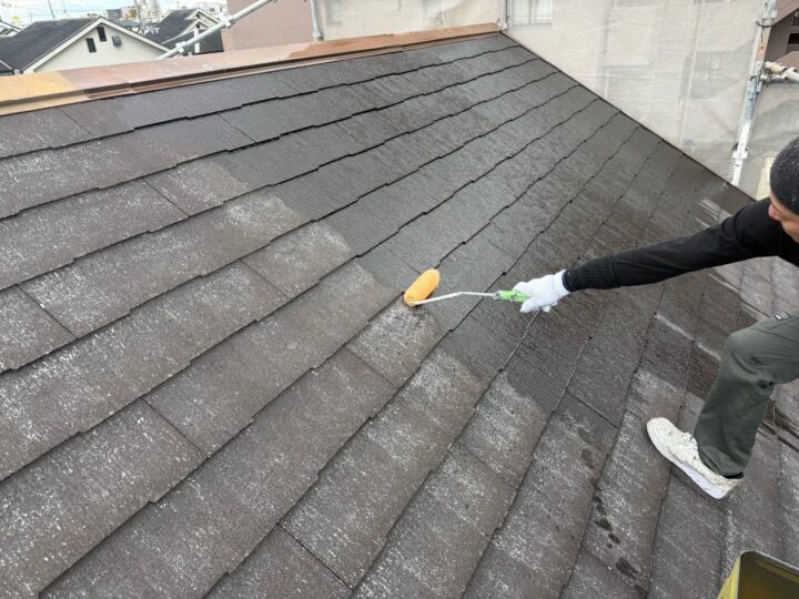 屋根の下塗りを行い下地の吸い込みを止め、密着力を高めます。