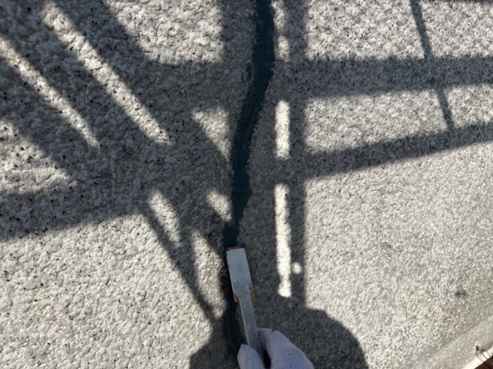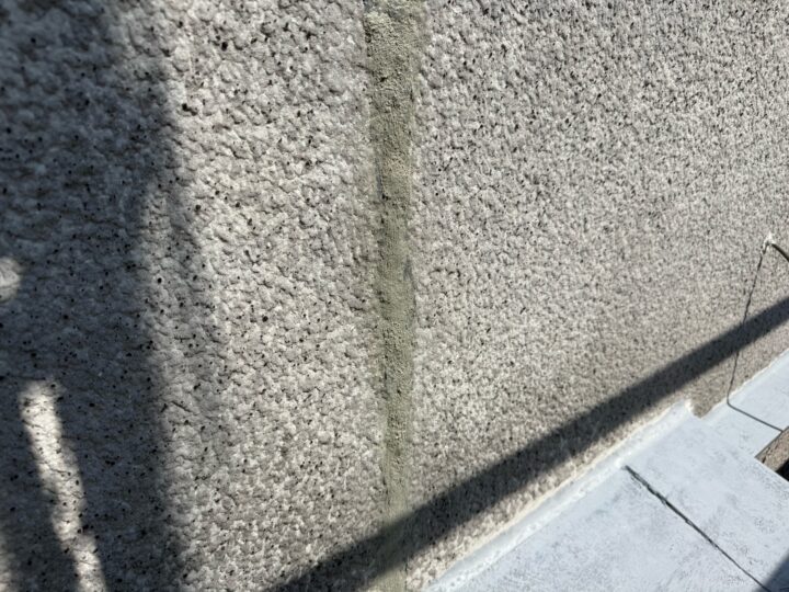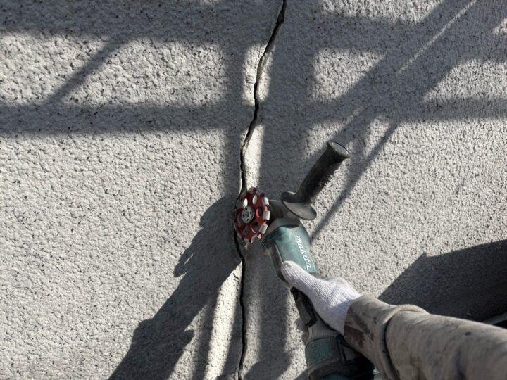 0.3m以上のひび割れはUカットシール材充填工法で補修を行います。ディスクグラインダーを使用してひび割れに沿ってU形(またはV型)に外壁をカット。