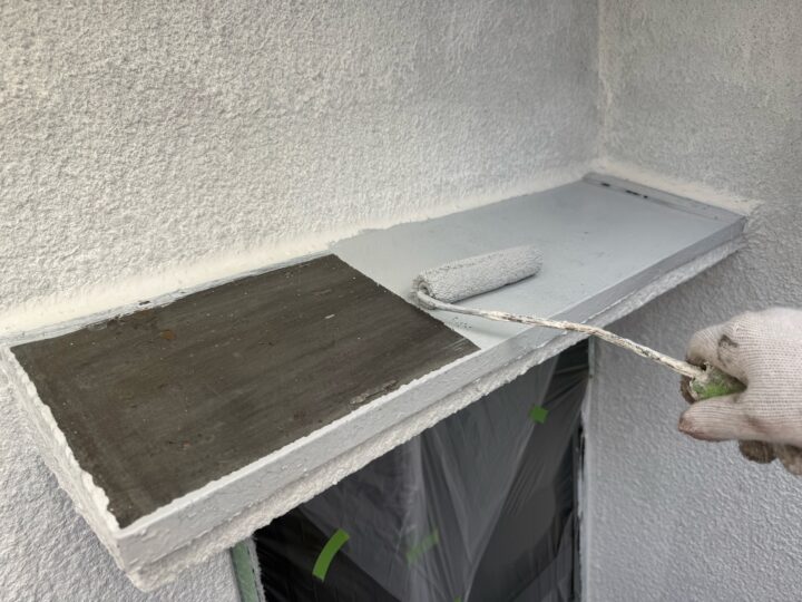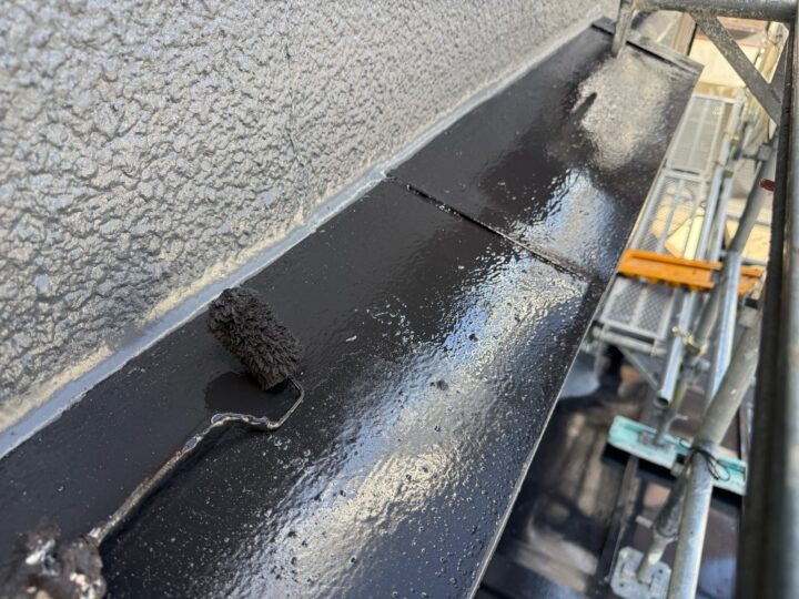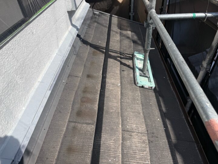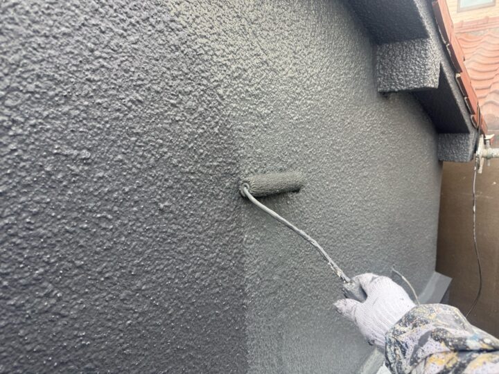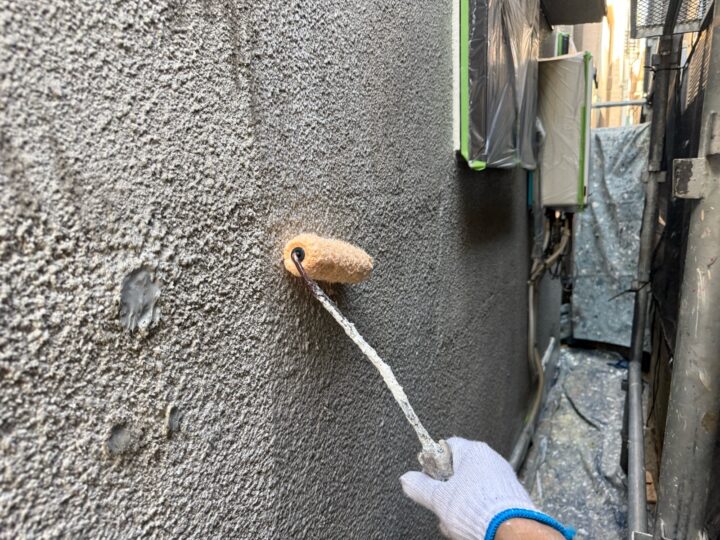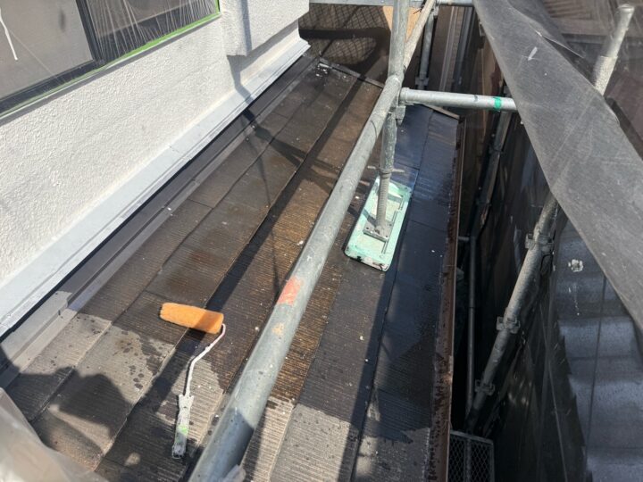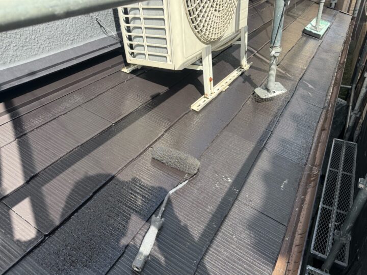 屋根の下塗りを行い、下地の吸い込みを止めます。
