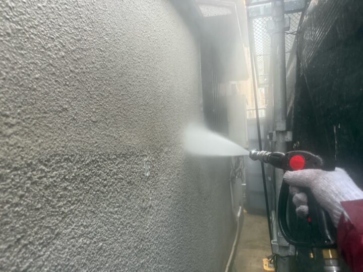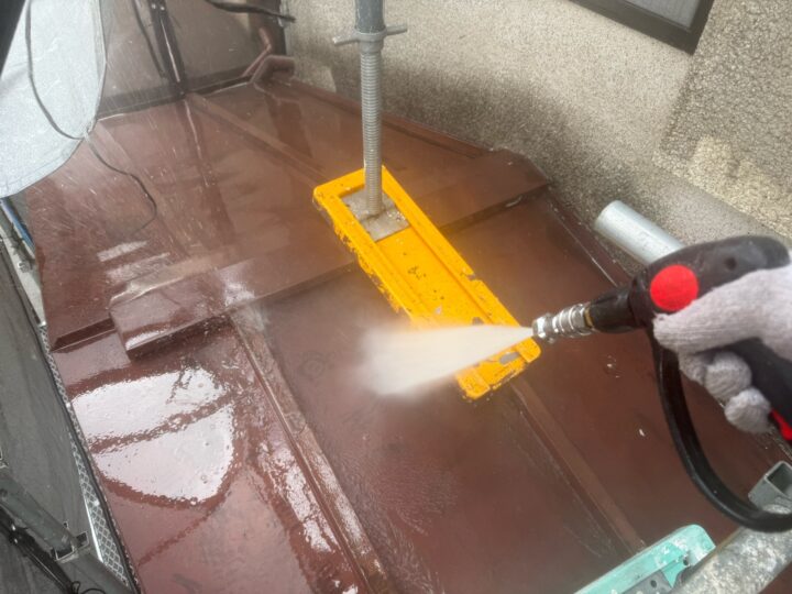 水が濁り汚水が外壁を汚さないように屋根から洗浄を行います。